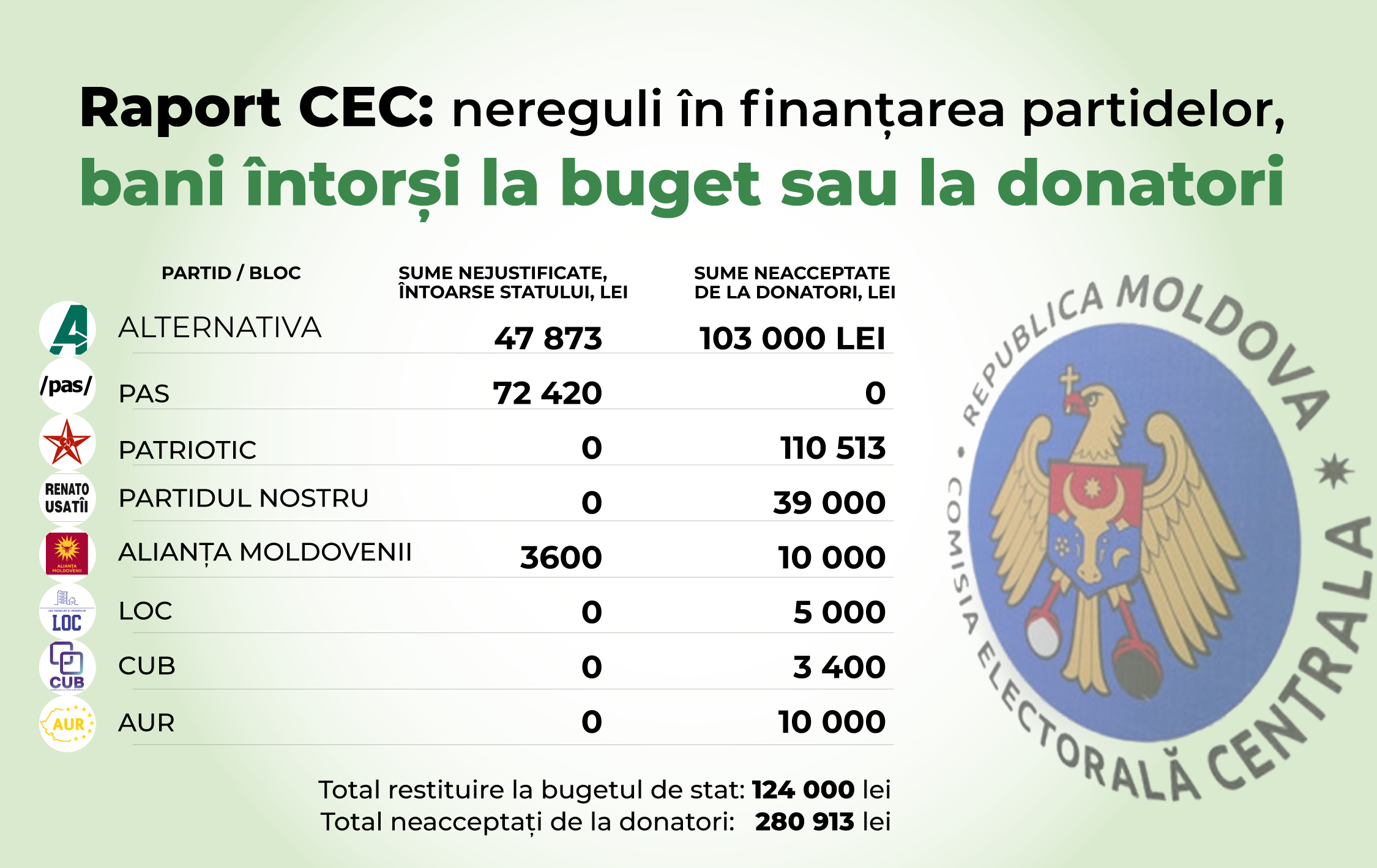 Comisia Electorală Centrală (CEC) a început să aplice modificările legislative operate în ultimii ani privind finanțarea partidelor și a identificat deja un total de 124 de mii de lei donații făcute în actuala campanie electorală, dar pe care donatorii nu le-au putut justifica. Astfel, banii au fost transferați statului. Moldova Curată a verificat listele de donații din actuala campanie a tuturor concurenților electorali și a constatat că și acum, ca și la scrutinele precedente, pe liste găsim persoane cu venituri modeste care, teoretic, nu au avut de unde dona: pensionari, paznici, șomeri sau persoane temporar neangajate. CEC urmărește respectarea plafoanelor de donații și aplică mecanisme de control, însă verificarea donațiilor suspecte, inclusiv cele potențial fictive, se dovedește dificilă.