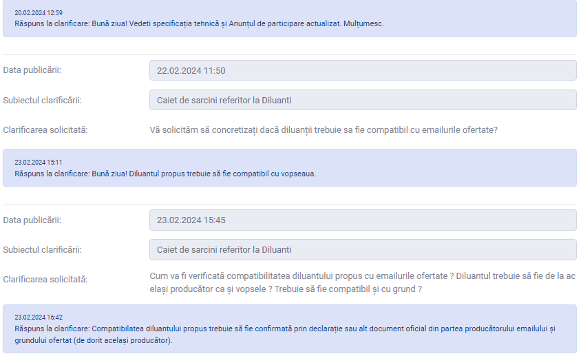 Autoritatea contractantă a oferit răspunsuri privind certificatele necesare pentru vopsele și diluanți, dar a venit și cu unele concretizări ale prevederilor din caietul de sarcini.