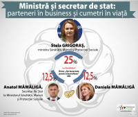 Stela Grigoraș, ministra Sănătății, Muncii și Protecției Sociale, îl are ca subaltern pe partenerul său de afaceri, Anatol Mămăligă. Acesta este secretar de stat, poziție similară cu cea de viceministru. Cei doi au fondat împreună ”Parteneriate pentru Dezvoltare” SRL, afacere care le întregește veniturile cu mii de lei anual. Stela Grigoraș și Anatol Mămăligă sunt și cumetri, ministra fiind nașa de botez a copiilor secretatului de stat.
