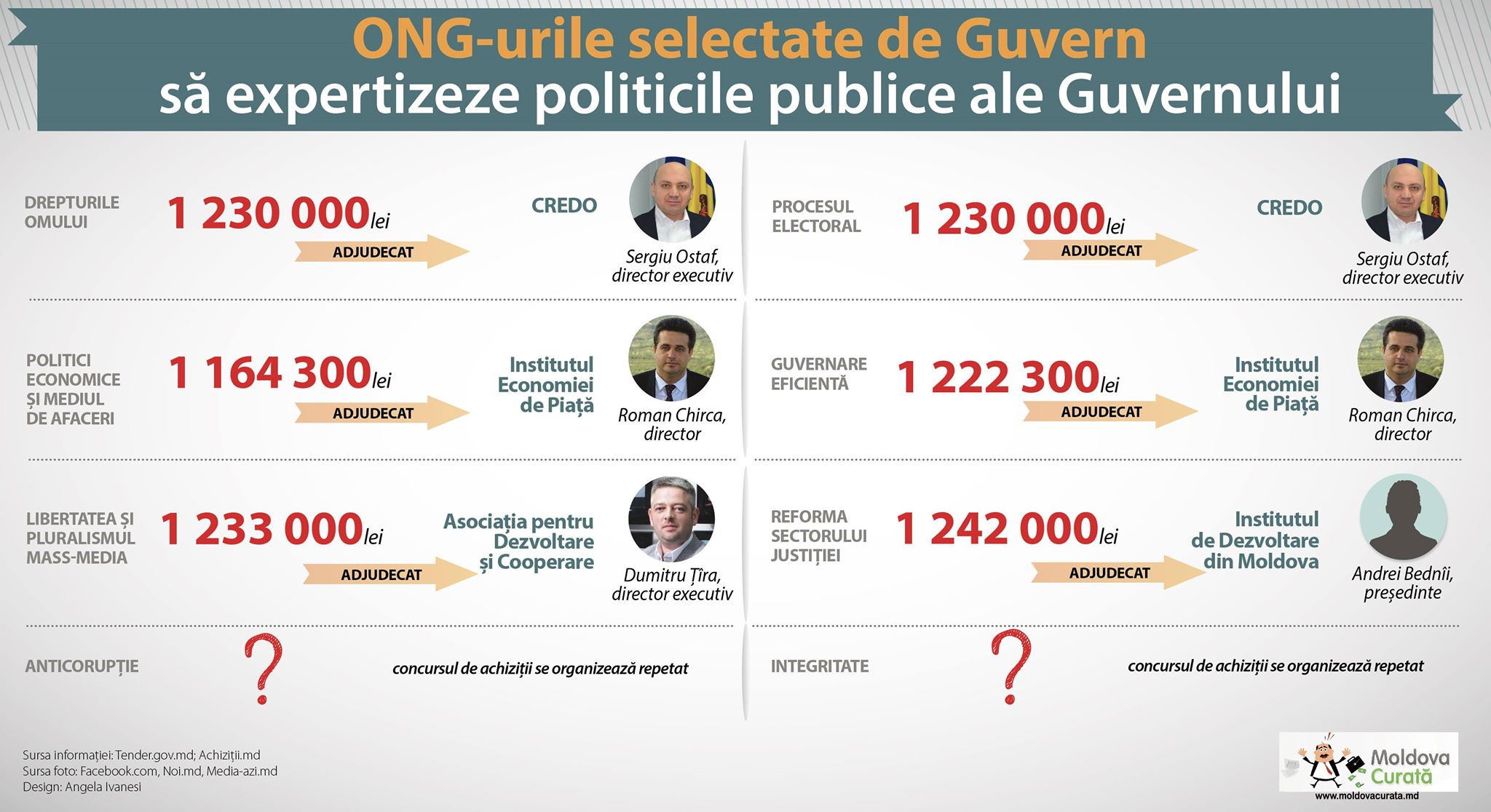 Cu câteva zile înainte de alegerile parlamentare, Cancelaria de Stat a organizat 8 licitații în urma cărora 4 organizații neguvernamentale au obținut contracte de milioane de lei. Cel puțin asta reiese din datele publicate pe pagina web a Agenției Achiziții Publice pe 22 februarie 2019. Organizațiile conduse de membrii Consiliului de Integritate al ANI Sergiu Ostaf și Dumitru Țîra, de analistul economic Roman Chirca și de o persoană cu numele Andrei Bednîi vor primi în total 7 milioane de lei pentru a expertiza și evalua politicile publice. La unele concursuri a participat câte un singur ofertant.