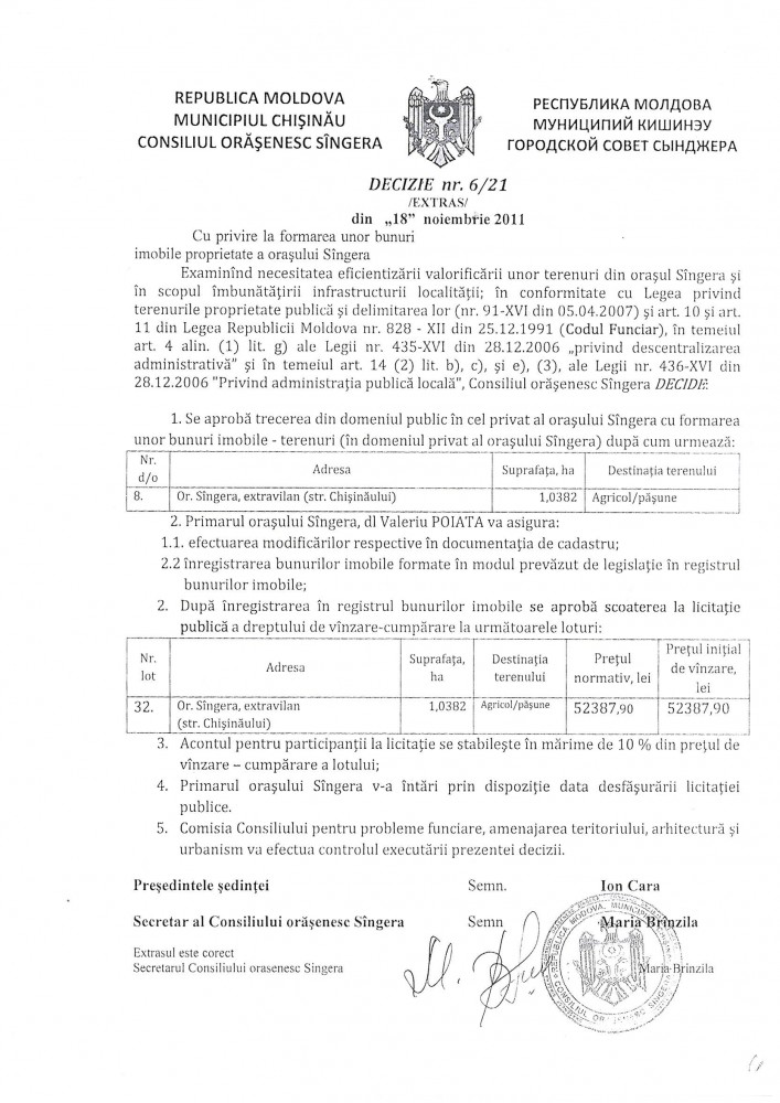 La scurt timp după alegerile locale din anul 2011, când Valeriu Poiată a devenit primar al comunei Sîngera pentru prima dată, Consiliul orășenesc Sîngera a decis să ia la balanța Primăriei un teren cu suprafața de 1,0382 ha din zona centrală a localității, care până atunci nu era folosit. Printr-o singură decizie, emisă la 18 noiembrie 2011, Cosiliul local a decis formarea bunului imobil și, în același timp, scoaterea lui la licitație funciară, fiind fixat, tot în aceeași decizie, și prețul – 52 387,90 lei, echivalentul a aproximativ 2,5 mii de euro.