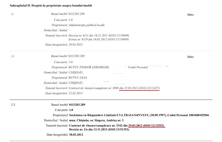 Extras din fișa cadastrală a terenului. La o săptămână după încheierea contractului cu Primăria, câștigătorul licitației funciare a vândut lotul de pământ firmei lui Valeriu Poiată