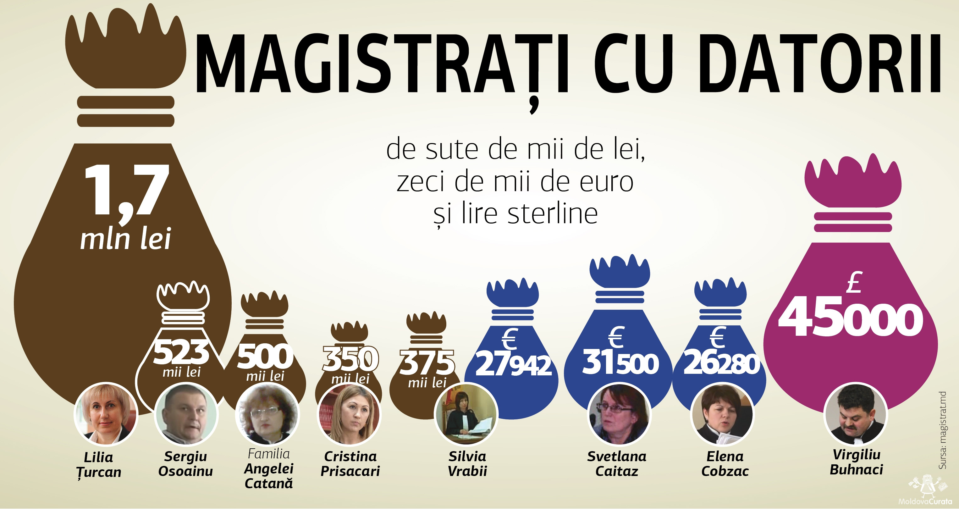 Circa 170 de judecători de la instanțele de fond şi de apel din Republica Moldova au indicat în declaraţiile lor de avere şi interese personale pentru anul 2016 împrumuturi de zeci sau sute de mii de lei, zeci de mii de euro sau lire sterline de la bănci şi rude. Împrumuturile au fost luate chiar dacă în ultimii ani salariile magistraţilor au crescut considerabil, comparativ cu cele ale altor bugetari, bunăoară medici sau profesori. Cel puţin opt dintre aceştia, cu datorii de sute de mii de lei, se angajează, spre deosebire de ceilalţi, să întoarcă banii în câțiva ani. Dacă e să raportăm la veniturile familiilor unora dintre ei, rambursarea datoriilor i-ar putea lăsa fără economiile adunate din salarii, pensii sau alte venituri legale. Au contractat credite și magistrați care dețin locuințe şi mașini scumpe. Constatările au fost făcute după ce am analizat cele 418 declaraţii de avere ale judecătorilor pentru anul trecut. Unii experţi subliniază că dependența magistraţilor de anumiți creditori trebuie privită ca factor de risc pentru sistem. Ei admit că unele din aceste împrumuturi de la persoane fizice pot fi privite ca forme quasi-legale de justificare a unor venituri ce ar fi fost obținute ilegal. Şi în cazul împrumuturilor de la persoane fizice, dar şi în cazul creditelor de la bănci, situaţia ar trebui monitorizată de Autoritatea Naţională de Integritate (ANI) ca să nu existe riscul ca unii creditori să influențeze examinarea unor dosare şi luarea unor decizii în favoarea lor.