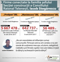 Bugetul raionului Telenești este o sursă continuă de venituri pentru firmele unor consilieri locali, primari din raion sau angajați ai administrației raionale. În domeniul construcțiilor și reparației de clădiri și cel al reparației drumurilor un segment aparte din licitațiile publice revine firmelor ce aparțin familiei șefului secției construcții, Iacob Stegărescu. Două întreprinderi ale familiei acestuia, „Maristecons” și „Prodpan”, câștigă în mod constant contracte de prestare a serviciilor, fie la primăriile din raion, fie la diferite instituții de stat subordonate Consiliului Raional. Iacob Stegărescu, chiar dacă nu face parte din comisiile de concurs în procesul de achiziții, este persoana care întocmește/avizează planurile anuale de reparații și autorizează lucrările.
