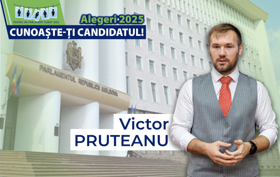 Victor Pruteanu (33 de ani) este candidat al Blocului electoral Alternativa din partea Partidului Mișcarea Alternativa Națională (MAN), condus de primarul Capitalei, Ion Ceban. Pruteanu este al 13-lea pe listă. Este jurist de profesie, deține funcția de consilier în cabinetul primarului Ion Ceban și un membru activ al Partidului MAN, formațiune care se declară cu viziuni proeuropene, deși liderul său a avut anterior o retorică puternic anti-europeană.
