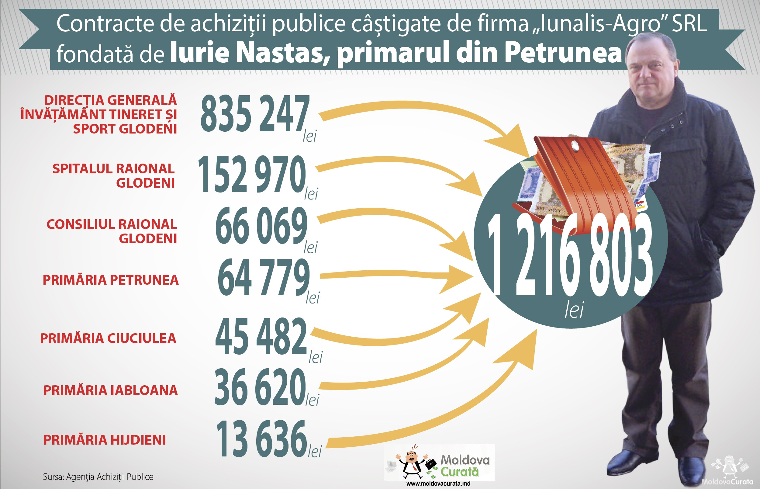 Firma fondată de Iurie Nastas, primarul satului Petrunea din raionul Glodeni, aprovizionează cu pâine de mai mulţi ani grădiniţa din localitate, dar şi alte instituţii publice din raion. În cinci ani, firma primarului a câştigat 18 contracte de achiziţii publice, cu valoarea totală de peste un milion 200 de mii de lei. Alesul local spune că atât timp cât pâinea este ieftină şi calitativă, nu se poate lua în considerare un eventual conflict de interese.