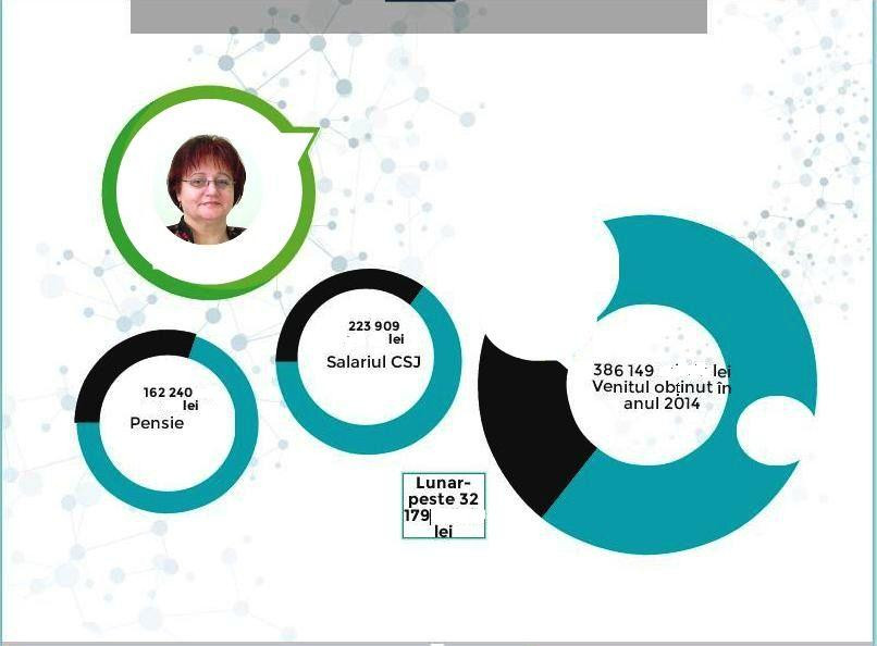 Nici venitul judecătoarei nu a fost unul modest anul trecut. Din salariul său de la locul de muncă de bază şi din pensie, ea a obţinut 386 142 de lei, adică în medie de 32 179 de lei lunar.