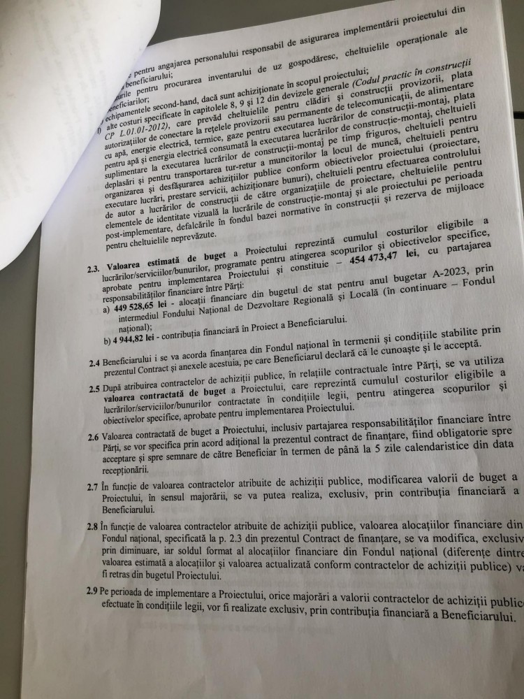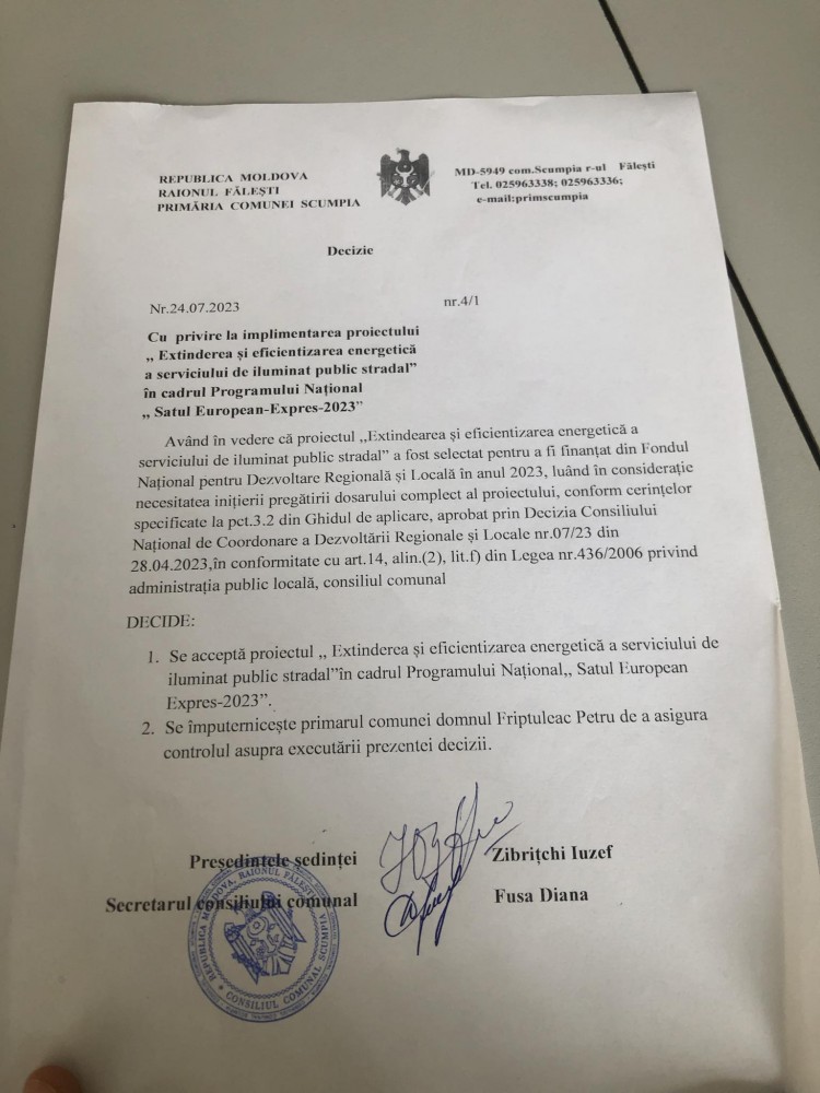 În baza acelei decizii din iulie 2023, a fost elaborat și la 16 august 2023 a fost semnat contractul de finanțare în valoare de 454 473, 47 de lei, dintre care contribuția Primăriei a fost de 4 944, 82 de lei. În calitate de finanțator este ONDRL, iar de beneficiar – Primăria Scumpia.