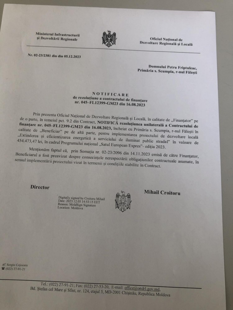 La 14 noiembrie 2023, Oficiul Național de Dezvoltare Locală și Regională a expediat o somație pe numele lui Petru Friptuleac în care anunța că, din cauza nerespectării angajamentelor, contractul urmează să fie rezoluționat. La 5 decembrie 2023 Primăria a fost deja informată oficial, printr-o notificare a ONDRL, că contractul a fost desfăcut.