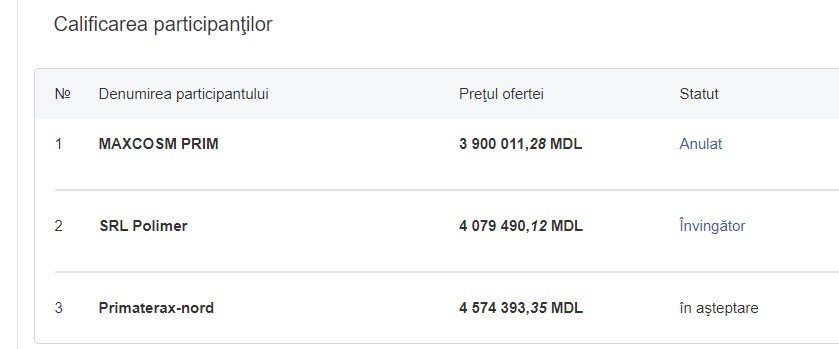 La 2 noiembrie 2022, Primăria a anunțat o licitație deschisă repetată, la care și-au depus ofertele 3 agenți economici: același „Maxcosm Prim”, care câștigase prima oară, ,,Polimer” SRL și „Primaterax-nord” SRL. Câștigător a fost declarat „Polimer”, cu un preț ofertat de 4,07 milioane de lei.