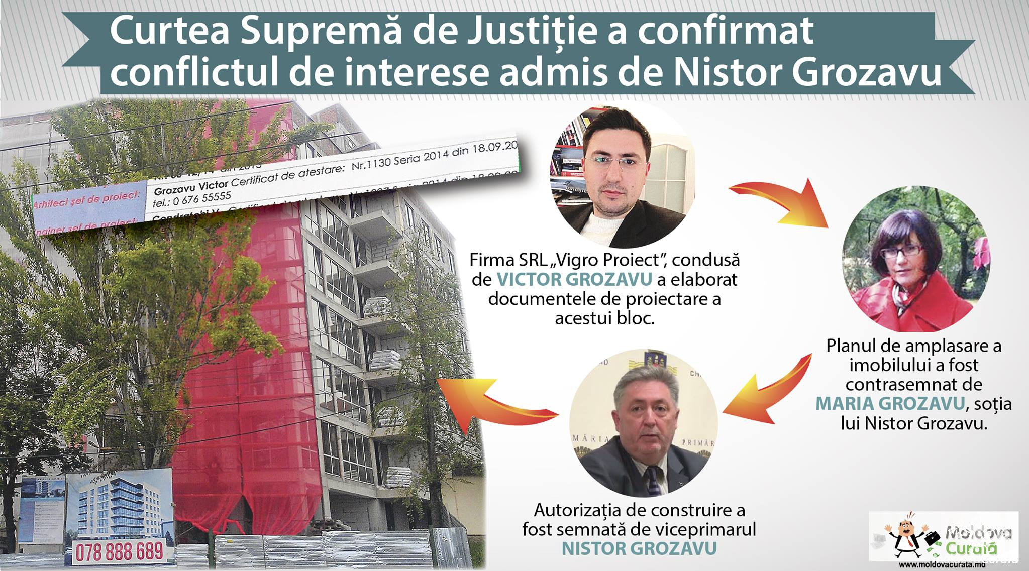 Curtea Supremă de Justiţie a decis că viceprimarul municipiului Chişinău, Nistor Grozavu, a încălcat regimul juridic al conflictului de interese. Funcţionarul a semnat în anul 2014 o autorizaţie de construire, elaborată în baza documentaţiei de proiect, întocmită de firma fondată şi administrată de fiul său, Victor Grozavu. Deşi decizia CSJ este definitivă, Consiliul Municipal Chişinău nu se grăbeşte să-l demită pe viceprimar, aşa cum prevede legea, argumentând că e o problemă personală a lui Nistor Grozavu.