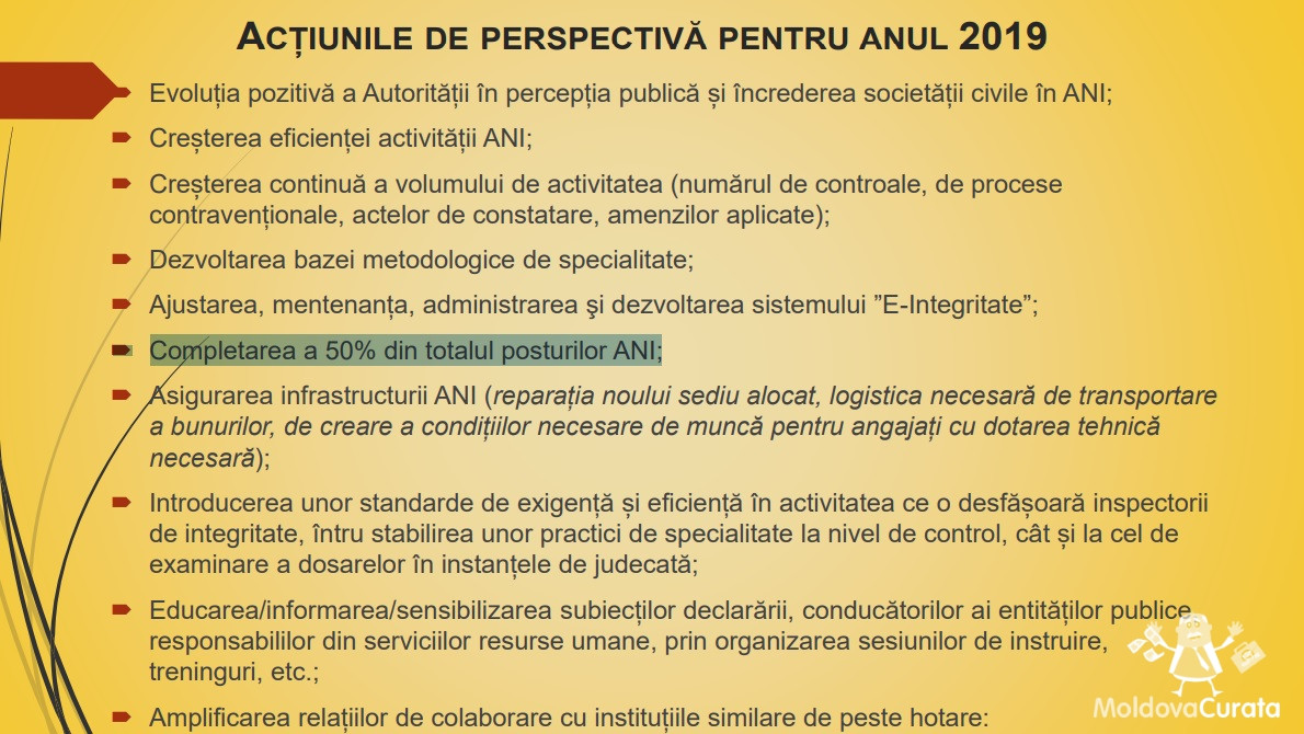 Astfel, președinta ANI, Rodica Antoci, a anunțat în cadrul raportului privind activitatea instituției pentru 2018, prezentat Consiliului de Integritate al ANI, că în acest an, 2019, își propune completarea a doar 50 la sută din totalul posturilor ANI, din cauza moratoriului. Ea a declarat că cifra a fost stabilită la recomandarea Ministerului Finanțelor, deși bugetul ANI ar permite angajarea a 100 de procente din personal.