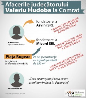 Magistratul Valeriu Hudoba de la Judecătoria Comrat a evitat să raporteze în ultima sa declarație de avere disponibilă, cea pentru 2016, două firme fondate de soția sa. Una dintre cele două afaceri administrează o piață comercială din Comrat, pe care judecătorul a procurat-o acum aproape doi ani, de la un fost deputat liberal-democrat, în prezent consilier municipal în cel mai mare oraș din Găgăuzia. Valeriu Hudoba nu a indicat venitul încasat din darea în locațiune a spațiilor de pe teritoriul pieței, motivând că veniturile ajung în conturile firmei și nu direct în cele ale familiei sale. În același timp, judecătorul nu a raportat și un apartament de 50 de metri pătrați, unde este înscris încă din 1999.
