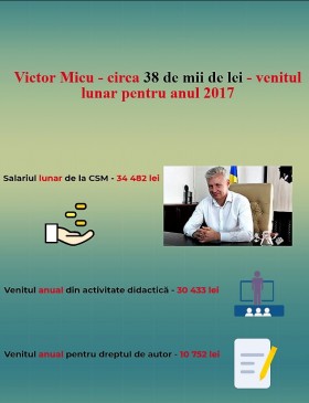 Președintele Consiliului Superior al Magistraturii (CSM), Victor Micu, a avut anul trecut un venit lunar de circa 38 de mii de lei. În jur de patru mii de lei pe lună a obținut din activitatea didactică și din dreptul de autor, însă cea mai mare sumă a ridicat-o în calitate de președinte al CSM: circa 414 de mii de lei anual sau peste 34 de mii de lei lunar.