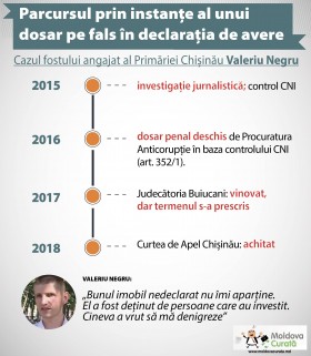 Fostul șef al Direcției Asistență Socială a Primăriei Chișinău, Valeriu Negru, urmărit penal pentru faptul că nu a indicat în declarația de venituri și proprietăți un bloc de locuit, a fost achitat acum câteva zile de către Curtea de Apel Chișinău. Sentința vine după ce prima instanță l-a recunoscut vinovat, însă a încetat procesul penal din cauza expirării termenului de prescripție. Procuratura Anticorupție intenționează să conteste hotărârea Curții de Apel la Curtea Supremă.