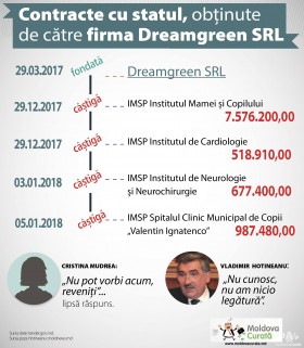 Dreamgreen SRL, firma înființată de Cristina Mudrea, fosta asociată a fiicei deputatului democrat Vladimir Hotineanu și fina de cununie a acesteia, la mai puțin de un an de la fondare, a câștigat contracte de achiziție în valoare totală de circa zece milioane de lei pentru spălarea rufelor din instituțiile medicale. Afacerile continuă să meargă bine și la cealaltă firmă administrată de Cristina Mudrea, Întreprinderea Mixtă Cristal Clean SRL, co-fondată de Iulia Scobioală, fiica lui Vladimir Hotineanu, retrasă ulterior din echipa fondatorilor companiei. Doar în ultimul an firma a câștigat tendere la stat în valoare totală de peste cinci milioane de lei.