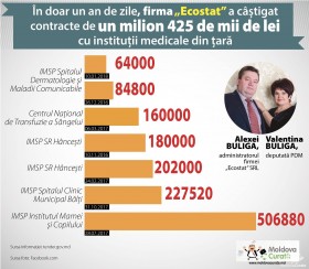 Timp de un un an, firma ”Ecostat” SRL condusă de Alexei Buliga, soțul deputatei democrate Valentina Buliga, a câștigat șapte contracte de achiziții publice în valoare de un milion 425 de mii de lei. Firma s-a angajat să colecteze, să transporte și să neutralizeze deșeurile medicale din cinci spitale din țară.