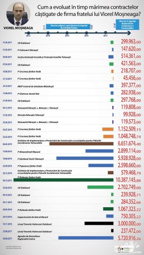Firma fratelui șefului Agenției Naționale pentru Soluționarea Contestațiilor (ANSC), Viorel Moșneaga, a câștigat, de când acesta a fost numit în funcție, două licitații publice, semnând cu statul contracte de șase milioane de lei. Asta în condițiile în care agenții economici care au participat la tenderele respective nu au putut să conteste rezultatele licitațiilor, dat fiind că ANSC a devenit funcțională abia în septembrie 2017. Întâmplător sau nu, contractele au fost semnate după ce Viorel Moșneaga a fost numit director la Agenția responsabilă de soluționarea contestațiilor în achiziții publice.