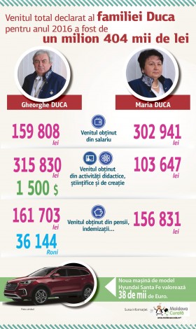 Venitul pentru anul 2016 al familiei președintelui Academiei de Ştiinţe a Moldovei (AŞM), Gheorghe Duca, este la fel ca și cel pentru anul 2015 - soții au ridicat lunar 117 mii de lei. Doar că anul trecut familia a dobândit o mașină în valoare de 38 de mii de euro, pe care o achită în rate, conform declarațiilor demnitarului.