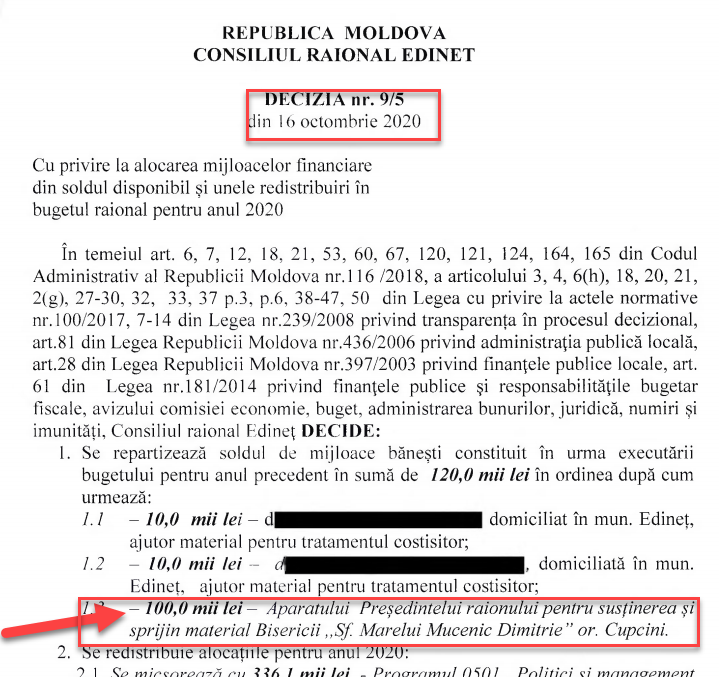 În Decizia din 16 octombrie 2020, această sumă este ascunsă, astfel că locuitorii orașului nu văd câți bani au fost repartizați bisericii în timpul campaniei electorale. Secretara Consiliului local, Ludmila Magu, a precizat că digitizarea sumei a fost o eroare tehnică.