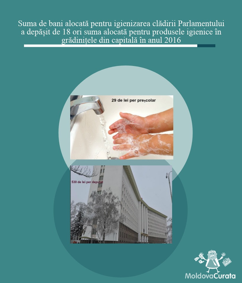 În 2016, în clădirea Legislativului au activat peste 560 de persoane. Dacă e să raportăm la numărul angajaților Secretariatului Legislativului, dar și al deputaților și echipelor acestora (consilieri și asistenți), pentru procurarea produselor igienice destinate unei persoane din Parlament a fost alocată suma de 530 de lei. Această sumă depășește de 18 ori suma planificată pentru un copil în instituțiile preșcolare din capitală.