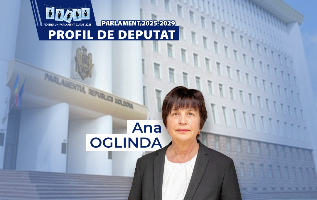 Ana Oglinda (66 de ani) este deputată a Partidului Acțiune și Solidaritate, la al doilea mandat în Legislativ. A candidat a 64-a pe lista electorală PAS și a acces în Parlament după demisia altor colegi de-ai săi, situați mai sus în listă. Este membră în Comisia parlamentară pentru protecție socială, sănătate și familie.