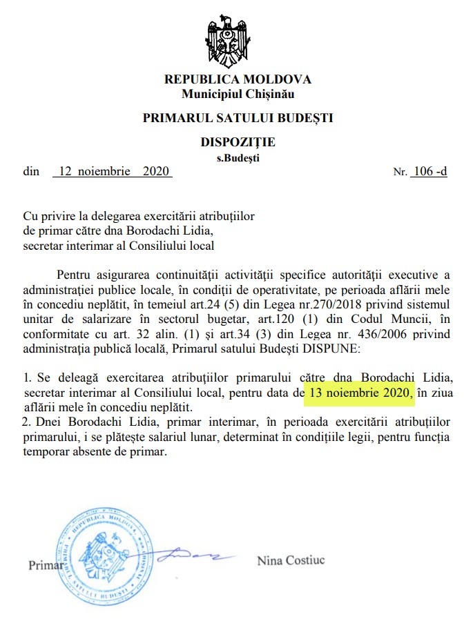 Și Nina Costiuc, primara satului Budești, l-a însoțit la briefing pe Ion Ceban. Pe portalul Registrului de stat al actelor locale este o dispoziție semnată de către Nina Costiuc, în care aceasta își ia o zi liberă, doar că actul vizează ziua de 13 noiembrie 2020, dar nu de 12 noiembrie, atunci când a participat la evenimentul electoral.