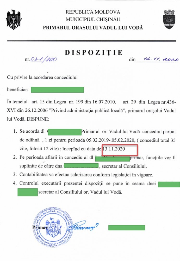 Pe portalul Registrului de stat al actelor locale este semnată dispoziția de acordare a concediului începând cu data de 13 noiembrie 2020. Iurie Onofriiciuc a închis imediat ce l-am întrebat de ce a participat la un eveniment electoral într-o zi de muncă.